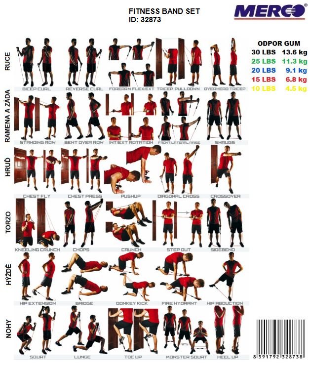 Posilovací sada Merco Fitness Band Set nabízí vysoce efektivní způsob posilování, tvarování celého těla a spalování kalorií všem svým uživatelům bez rozdílu, ať už jde o úplné amatéry nebo o profesionální sportovce. Posilovací sada Merco Fitness Band Set obsahuje pět trubkovitých gum s různou tuhostí, dvě molitanová madla pro ruce, dva pásky se suchým zipem na kotníky a jednu kotvu do dveří. Tedy vše pro maximální variabilitu cvičení a maximální možný počet dosažených cviků. Aby byly uspokojeny potřeby opravdu všech uživatelů, mají gumy nejenom pečlivě a s důmyslem odstupňovanou úroveň odporu, ale díky kovovým karabinám, jenž jsou součástí obou konců každé gumy, se gumy dají vzájemně kombinovat, aby byly uspokojeny i ty nejnáročnější tréninkové potřeby. Narozdíl od tuhosti mají odporové gumy Merco Fitness Band shodnou délku 115 cm, průměr 1 cm i materiál TPE (termoplastický elastomer), který je velice flexibilní, zdravotně nezávadný, příjemný na omak, a který si i při dlouhodobém používání a vysoké zátěži zachovává stoprocentní vlastnosti. Bonusem celé sady je textilní obal se stahováním pro usnadnění přepravy a uskladnění. Posilovací sada Merco Fitness Band Set Vám s minimálními náklady a minimálními požadavky na prostor pomůže maximálně efektivně zdokonalit Vaší fyzickou zdatnost.