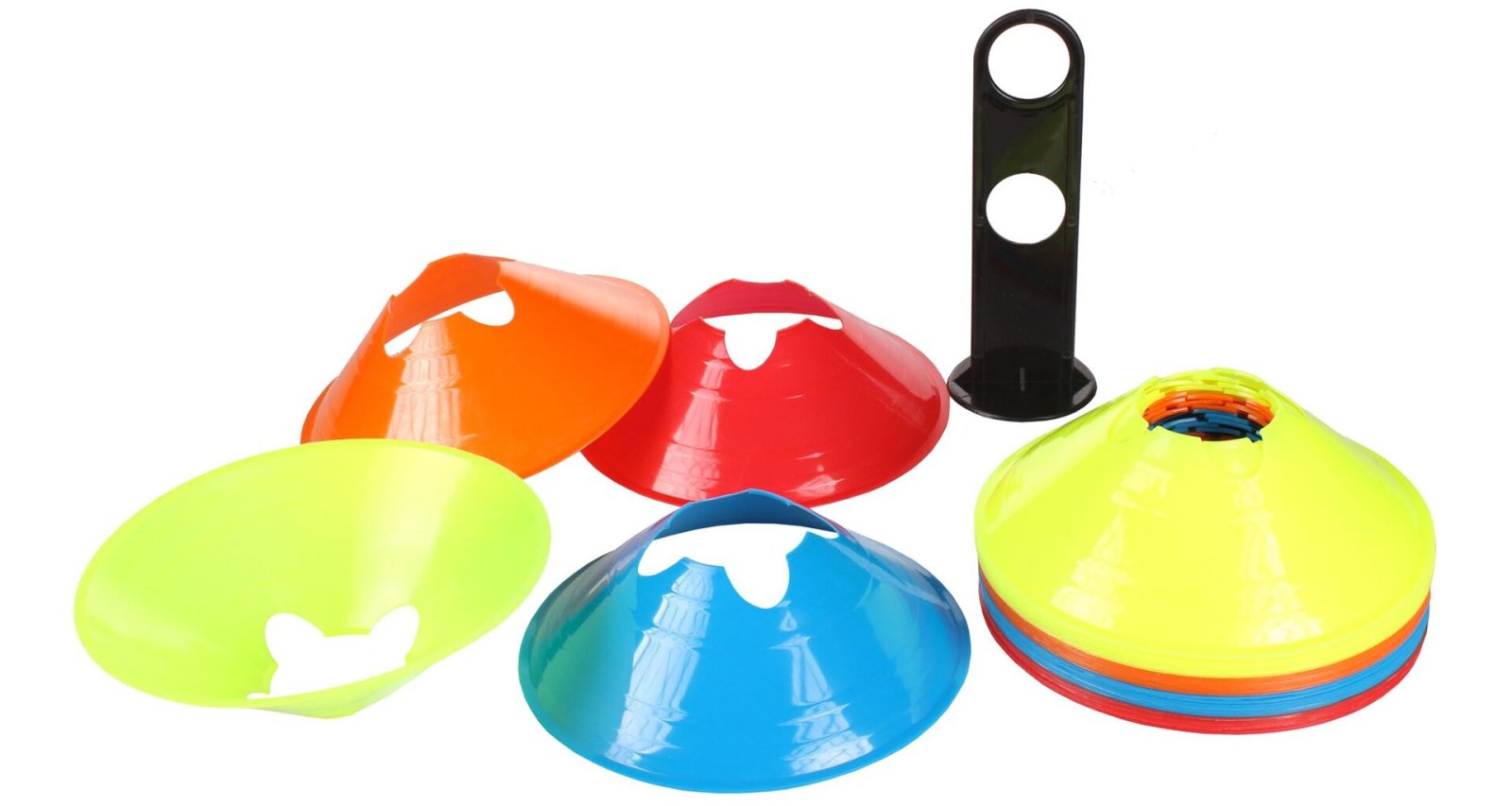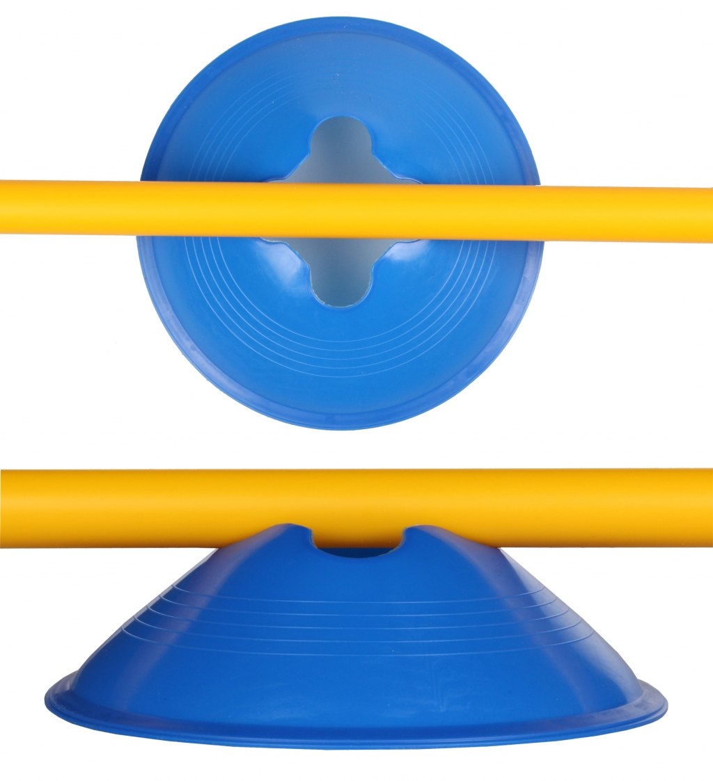 Sada 32 víceúčelových met ve čtyřech různých barvách pro vytvoření tréninkové dráhy, s výřezy pro překážkové tyčky.