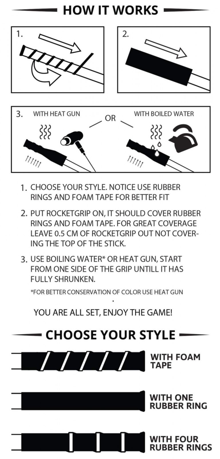 Instalace koncovky RocketGrip je velmi jednoduchá. Stačí si z přiložených kroužků a pásek nastavit výstupky dle požadavků uživatele a následně natáhnout pásku na vrchní část hole. Z vlastních zkušeností doporučujeme provést zahřátí spíše horkovzdušnou pistolí (výrobce uvádí i možnost zalití horkou vodou) a zároveň nechat na konci mírný přesah, aby koncovka na hokejce dobře držela.