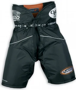 Propracované hokejové kalhoty se zvýšeným horním lemem pro ochranu boků, kyčlí a ledvin. Na zadní části je pohyblivý chránič páteře.