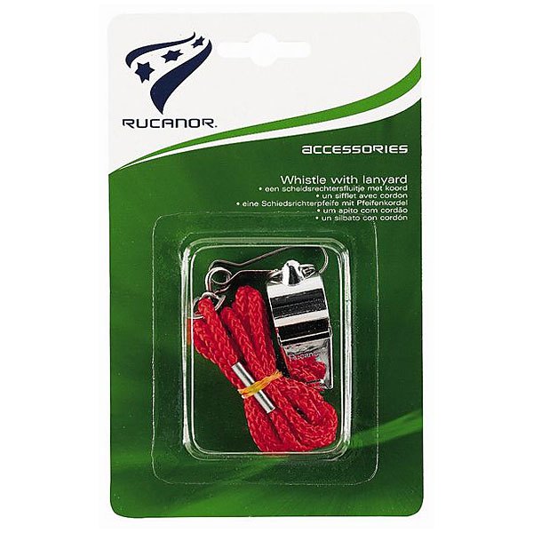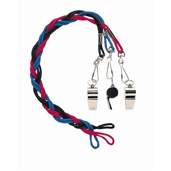 Kovová píšťalka s kroužkem a barevnou šnůrkou na krk nebo ruku.
