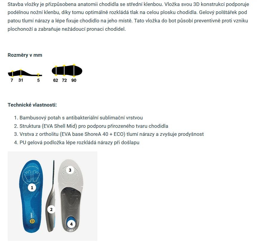 Stavba vložky je přizpůsobena anatomii chodidla se střední klenbou. Vložka svou 3D konstrukcí podporuje podélnou nožní klenbu, díky tomu optimálně rozkládá tlak na celou plosku chodidla. Gelový polštářek pod patou tlumí nárazy a lépe fixuje chodidlo na jeho místě. Tato vložka do bot působí preventivně proti vzniku plochonoží a zabraňuje nežádoucí pronaci chodidel.